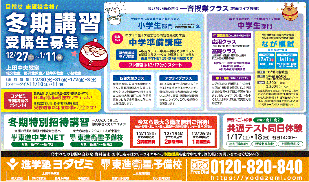 ヨダゼミの冬期講習(12/27〜1/11)は、短期間で学力を一気に伸ばすための集中プログラムが満載です。